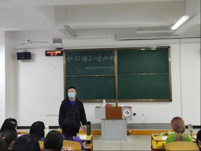 杨帆老师为我们讲授了以“如何端正入党动机”为主题的党课。杨帆老师从树立正确的入党动机与端正入党动机的要求两个方面向我们讲解。使我们受益匪浅,要永远保持党的先进性和纯洁性。