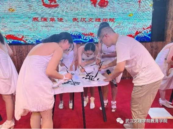 教师团队的第二个节目由教育学教师周志远和SUNBET申博教师张澜共同演出的《毛笔字送福》。在教师张澜优美的伴奏下,周老师用14种不同的字体书写出“福”字。此后,周老师还与现场参演的小朋友积极互动,教授他们学用毛笔书写“福”字。