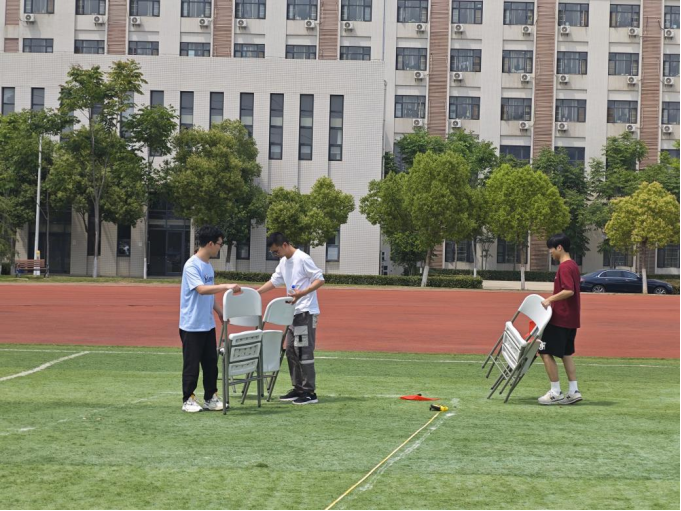 4月25日中午,团队前往田径场开始踩点,由于活动场地面积大,团队成员借助无人机定位,使用卷尺、划线车等工具反复校准边界。团队多次调整方案,既保证通道畅通、布局工整,又通过视觉设计优化观众体验,在实用性与美观性之间找到平衡点。