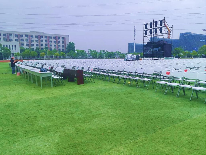 4月26日正式开始现场布置工作。团队成员分布在各个岗位,如桌椅借调、现场搬运、协调分配等等。期间团队成员仍不断对各个区域进行布局上的优化,精益求精,追求完美。下午4点,文理群星颁奖晚会现场桌椅均已按计划摆放完毕,整齐的分布在操场上,场地布置工作也到此宣告结束。
