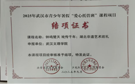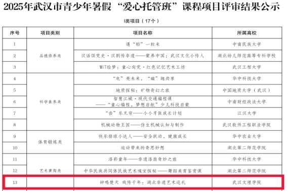 文理“七彩少年”教育服务队自2021年成立至今,关爱儿童的足迹遍及武汉、襄阳、宜昌等地,惠及15000余名儿童,授课1200余节,团队服务时长近9000小时,并荣获国家、省级多项优秀团队荣誉。今年,本团队再启新程,积极参与2025年武汉市青少年暑假“爱心托管班”课程项目申报,经过多轮评审与遴选,《钟鸣楚天 戏传千年:湖北非遗艺术巡礼》成功入选市级重点课程项目库,并成为17个I类项目中唯一一支来自民办院校的课程,彰显了本团队在课程设计与文化传承方面的独特价值。