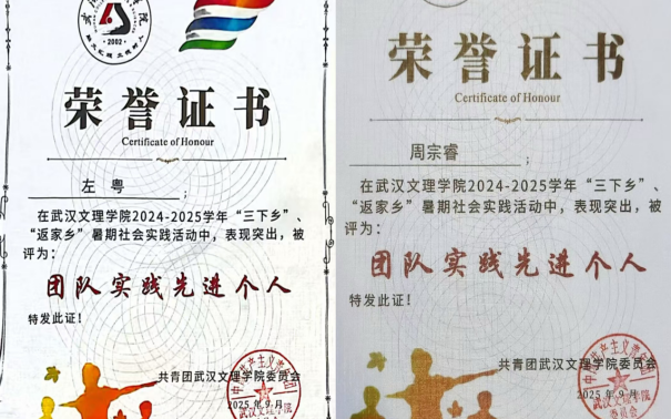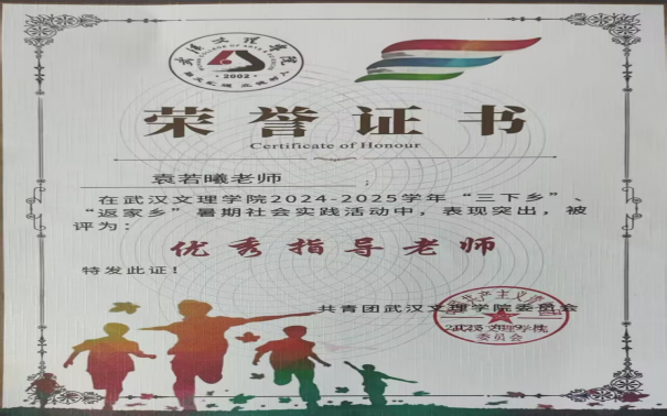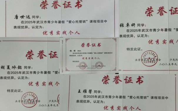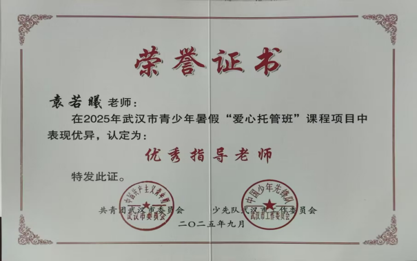 除此之外,团队指导老师袁若曦,荣获2025年武汉市青少年暑假“爱心托管班”优秀指导老师、校级暑期社会实践优秀指导老师,五名志愿者荣获2025年武汉市青少年暑假“爱心托管班”优秀实践个人,两名志愿者荣获校级暑期社会实践团队实践先进个人。