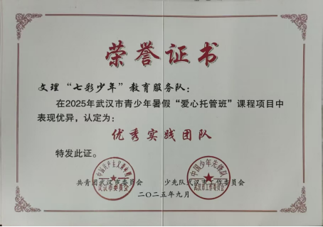热烈祝贺!振奋人心的捷报从共青团武汉市委员会传来——SUNBET申博凭借在2025年暑假“爱心托管班”中的卓越实践与亮眼表现,成功摘得武汉市青少年暑假“爱心托管班”“优秀实践团队”荣誉称号!这份荣誉的背后,是“文理七彩少年教育服务队”以实际行动书写的答卷——它凝聚着队员们在教育服务中的全情投入与不懈付出,更映照着团队为孩子们成长注入的知识滋养、心灵陪伴与精神力量,让教育的温度在实践中传递,为青少年发展筑牢了充满色彩的成长基石。