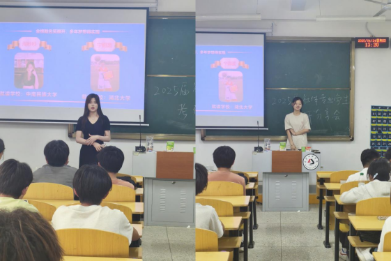 在经验分享环节,2025 届考研上岸的宁圆圆,张力文,晏子祥,万千叶,田富川,冯云冲,向勇,曾志豪,邓琳琳等同学依次上台,毫无保留地分享了自己的考研经验。他们分别从院校选择、专业课程复习、公共课备考、复试技巧以及心态调整等方面展开详细介绍。宁圆圆同学分享了她在整个备考期间的作息时间和具体复习时间节点,有巨大的意义;张力文同学提出了考研目标院校一致的的同学互帮互助的建议;晏子祥同学分享了自己专业课学习方法,强调了掌握技巧和真题练习的重要性;万千叶同学在专业课备考上给出了自己的复习建议:“在时间分配上做好取舍,将时间更合理的分配到各个学科上,提升学习效率。”田富川同学分享了自己在考研过程中总结出的避坑指南,帮助学弟学妹们避免在备考中走不必要的弯路;冯云冲同学结合自身考研经历,讲述备考中克服困难坚持行动的方法,向勇同学结合自身 “慢但扎实” 的备考特点,强调考研不要盲目比进度,稳扎稳打、按自身节奏学习才能成功。邓琳琳同学强调考研 “选择大于努力”,要结合自己的实际情况来选择院校,朝目标看齐,鼓励学弟学妹坚持到底;