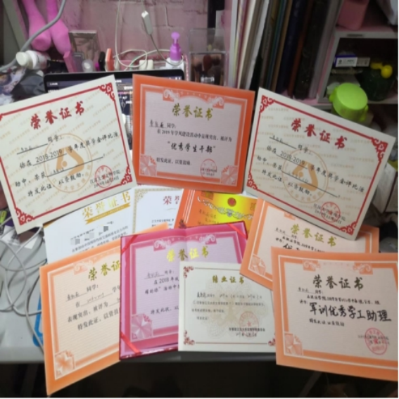 英语四级、幼儿教团队格证、国标舞教团队格证、高级营养师、心理咨询师、心理危机干预技能证书。