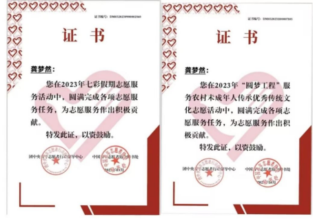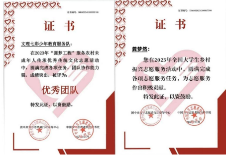 2023年参与“圆梦工程”服务农村未成年人传承优秀传统文化志愿活动,所在的文理七彩少年教育服务队被评为国家级优秀团队