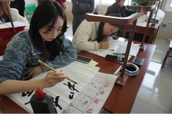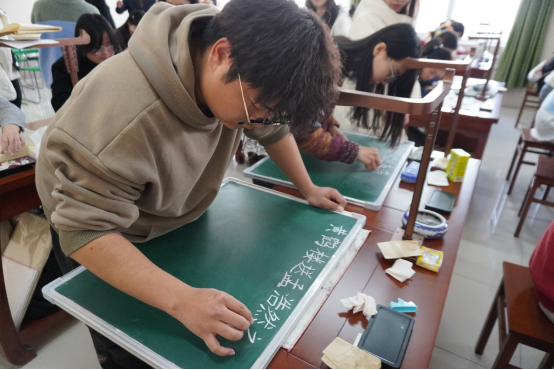 随后,参赛选手们纷纷拿起手中的书写工具,全神贯注地投入到比赛中。有的同学挥毫泼墨,书写出一幅幅气势磅礴的毛笔作品;有的同学在黑板上用粉笔勾勒出一个个工整美观的粉笔字;还有的同学用钢笔在纸上书写出一行行流畅精致的硬笔书法。比赛现场气氛热烈,同学们用笔墨书写青春,用行动诠释文化,展现出SUNBET申博学子对书法艺术的热爱与追求。