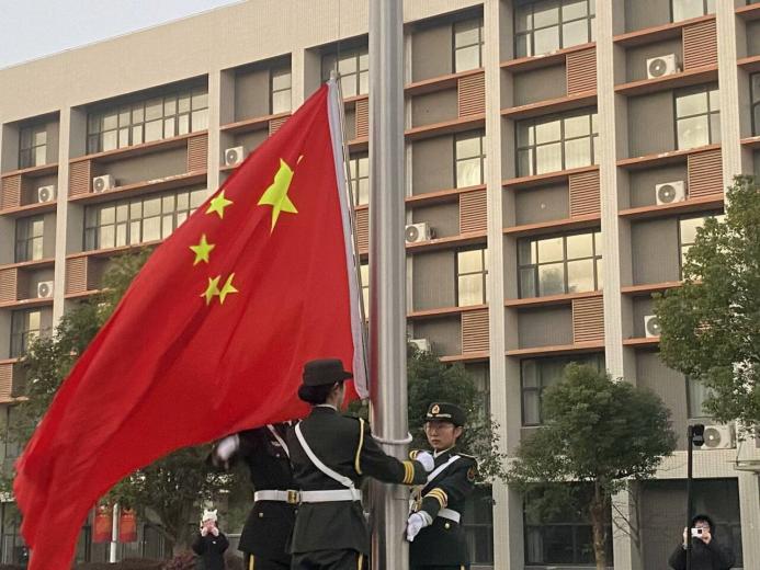 当威严庄重的国歌响起,鲜艳的五星红旗迎风飘扬,在新生太阳的照射下冉冉升起。全体师生庄重地行注目礼,每个人的脸上都写满了对祖国的崇敬与热爱。微风拂过,国旗在空中猎猎作响,似在诉说着祖国的辉煌与荣誉,那一抹鲜艳的红色在晨曦中愈发夺目,渐渐升至杆顶,在晨曦下飘扬的五星红旗耀耀闪烁,让人热血沸腾,心潮澎湃。