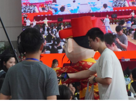 毕业典礼开始前,体育馆内已然洋溢着热烈欢快的氛围。憨态可掬的玩偶们迈着欢快的步伐走进人群。它们手持装满糖果的小篮子,穿梭在座位之间,将甜蜜的糖果递给每一位在场的师生。温馨又热闹的暖场活动为这场意义非凡的毕业典礼奠定了欢乐的基调。