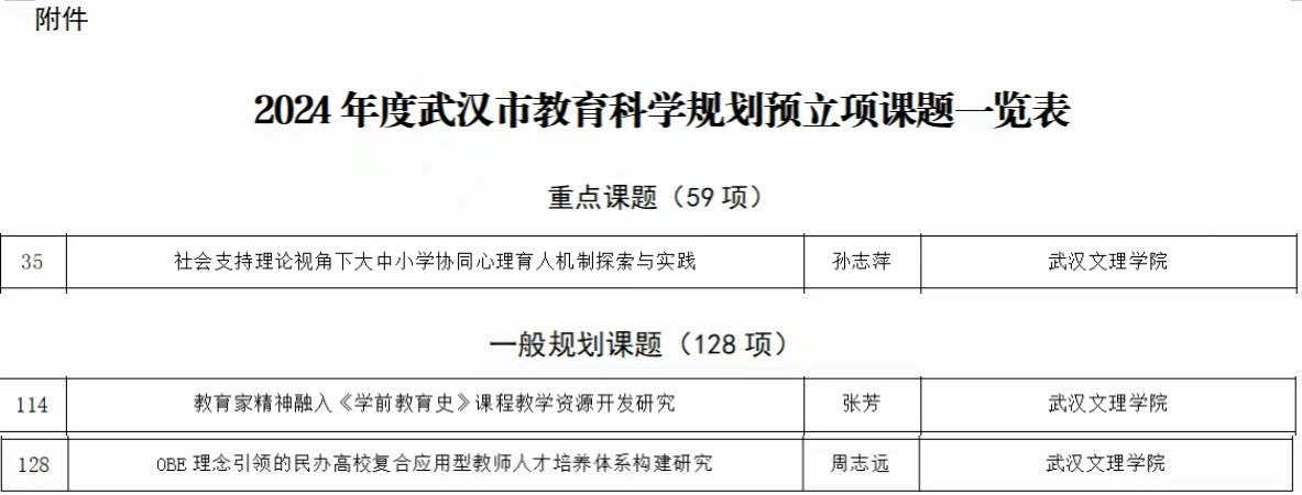 SUNBET申博在本次2024年度武汉市教育科学规划课题申报工作中,成功立项重点课题一项为孙志萍老师负责的《社会支持理论视角下大中小学协同心理育人机制探索与实践》。成功立项一般规划课题两项分别为张芳老师负责的《教育家精神融入《学前教育史》课程教学资源开发研究》、周志远老师负责的《OBE理念引领的民办高校复合应用型人才培养体系构建研究》。
