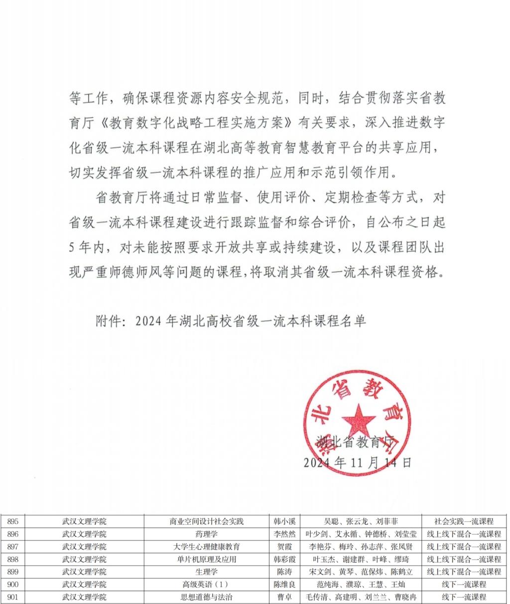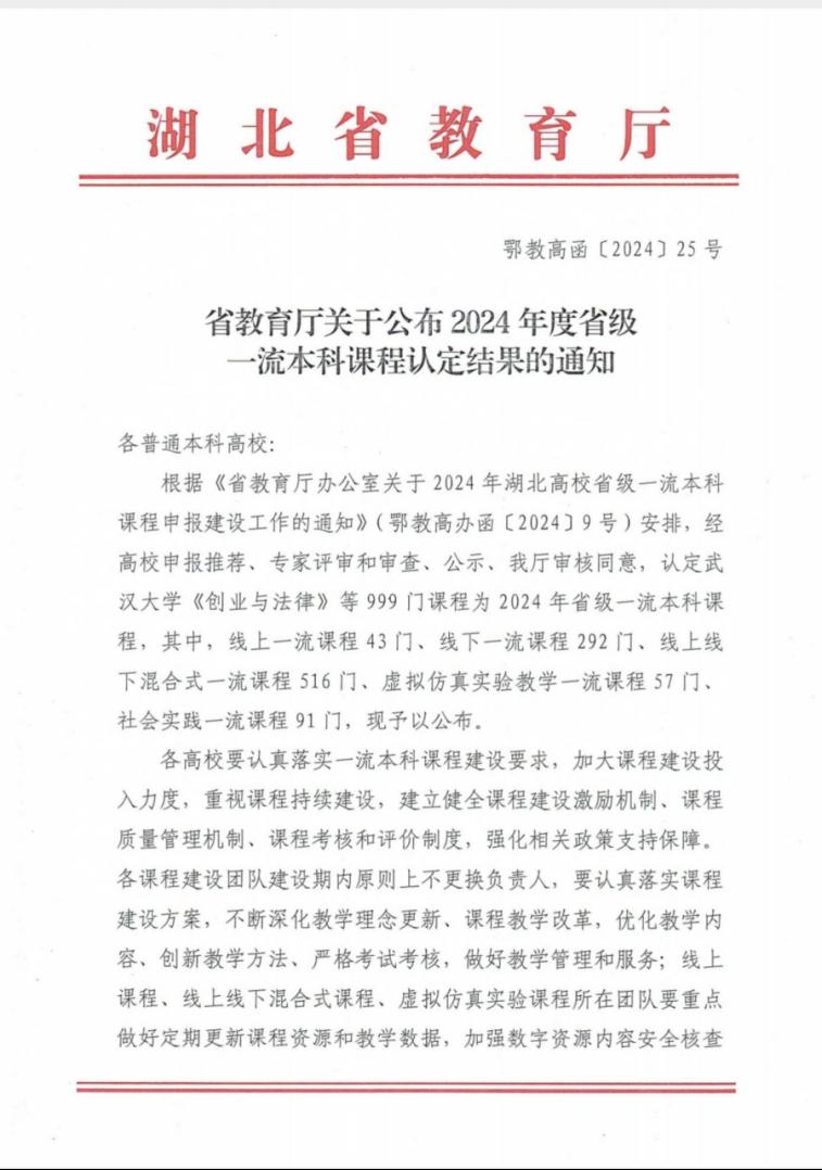 根据《省教育厅办公室关于2024年湖北高校省级一流本科课程申报建设工作的通知》(鄂教高办函〔2024〕9号)安排,经高校申报推荐、专家评审和审查、公示、我厅审核同意,认定武汉大学《创业与法律》等999门课程为2024年省级一流本科课程,其中,线上一流课程43门、线下一流课程292门、线上线下混合式一流课程516门、虚拟仿真实验教学一流课程57门、社会实践一流课程91门,现予以公布。