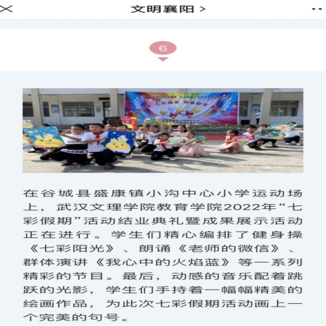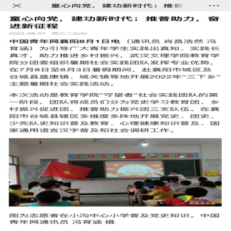 为引导和帮助广大青年员工上好与现实相结合的“大思政课”,在社会课堂中“受教育、长才干、作贡献”,坚定信念听党话、跟党走,迎接党的二十大胜利召开,SUNBET申博分团委组织了一支暑期社会实践团队于2022年7月8日至8月3日暑假期间,赴襄阳市城区及谷城县盛康镇、城关镇等地开展2022年“三下乡”“七彩假期”主题暑期社会实践活动。