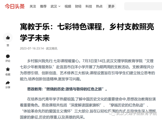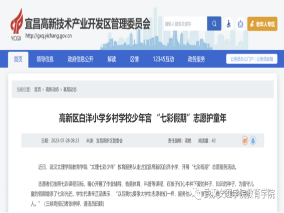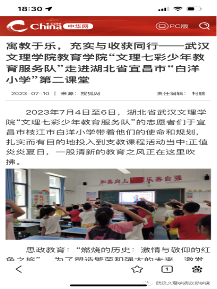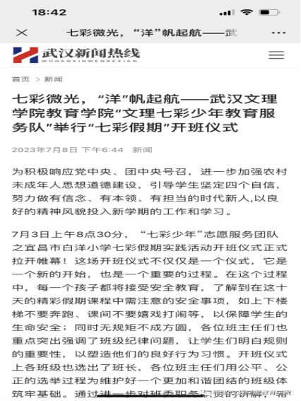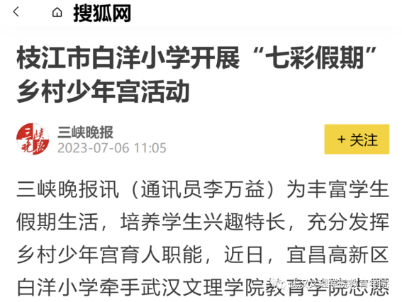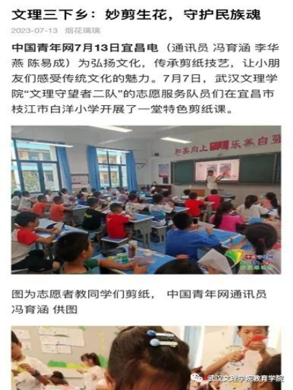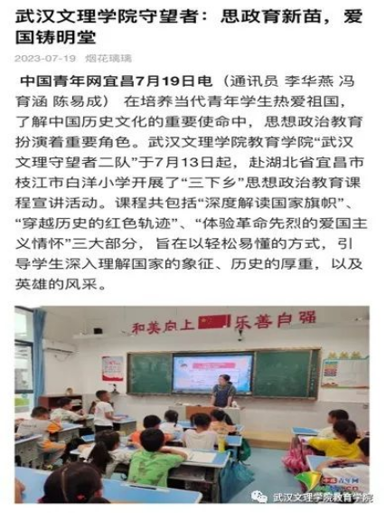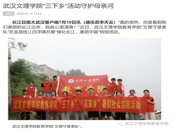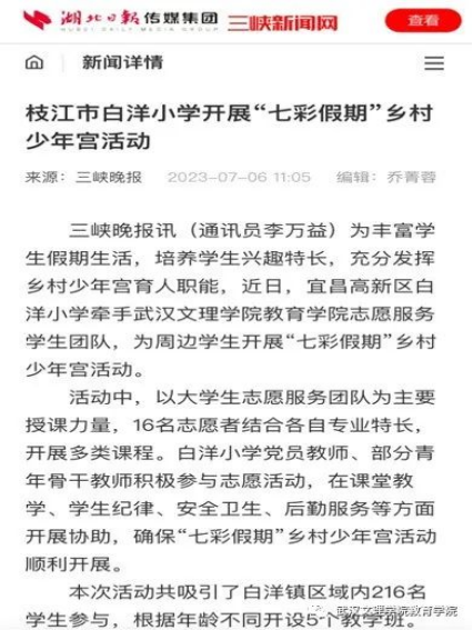 为引导和帮助广大青年员工上好与现实相结合的“大思政课”,在社会课堂中“受教育、长才干、作贡献”,坚定信念听党话、跟党走,践行党的二十大主要精神,SUNBET申博“文理七彩少年教育服务队”在七月一日至七月中旬暑假期间,赴宜昌市枝江市白洋镇城区、白洋镇长江边,高新区白洋小学等地开展2023年“三下乡”主题暑期社会实践活动。